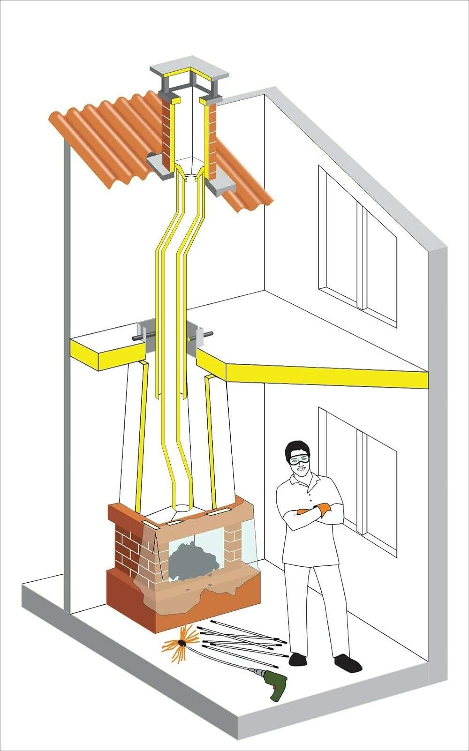 Izmantojot rotējošo dūmvada tīrīšanas komplektu TORNADO, nav nepieciešams kāpt uz mājas jumta!