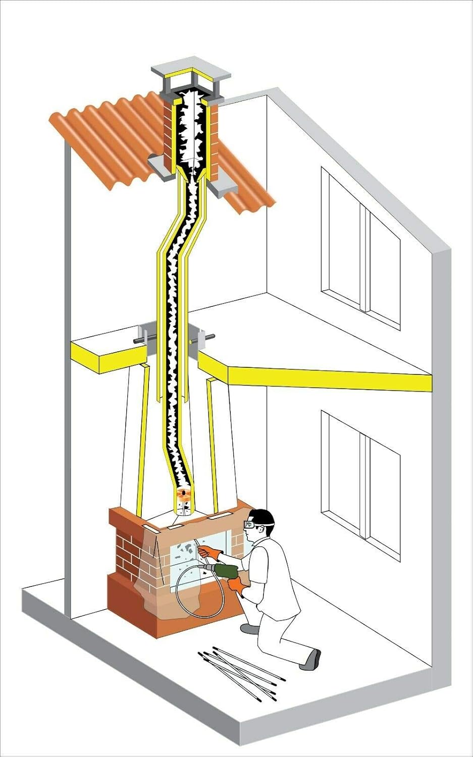 Izmantojot rotējošo dūmvada tīrīšanas komplektu TORNADO, nav nepieciešams kāpt uz mājas jumta!